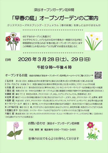 「早春の庭」オープンガーデンを開催します 4月、5月のオープンガーデンに先駆けて、クリスマスローズや可憐な球根花、早咲きの花木などを楽しんでいただける「早春の庭」オープンガーデンを11軒が公開します。皆様のお出でを心よりお待ちしております。 とき 3月28日(土)、29日(日)午前9時~午後4時 問い合わせ 深谷オープンガーデン花仲間 代表 栗原 實 090-7183-3481 ※自家用車でお越しの際は、交通ルールを守り、近所に迷惑が掛からないようお願いします。